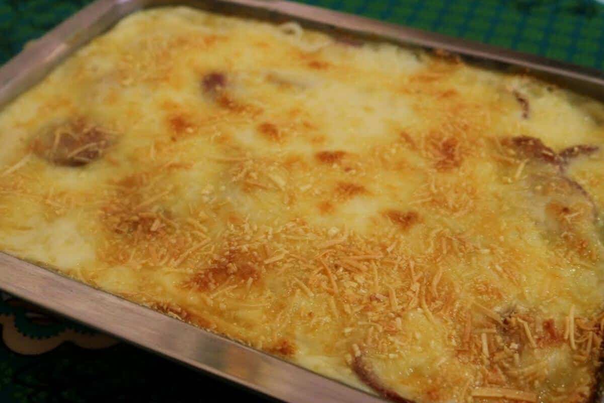 - Num refratário, ponha toda a batata, espalhe por cima dela a calabresa com cebola, cubra com o creme e polvilhe parmesão ralado por cima.