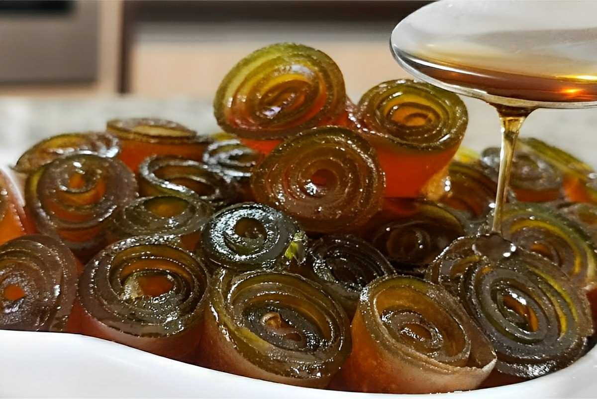 - O doce estando frio, vá retirando os “colares” da calda e corte a linha, soltando todos os rolinhos e passando-os para uma travessa. Reserve a calda da panela.
