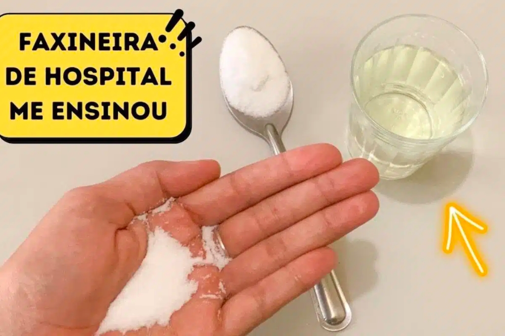 - Em uma tigela, coloque o sal e a água sanitária, misturando até ficar homogêneo.