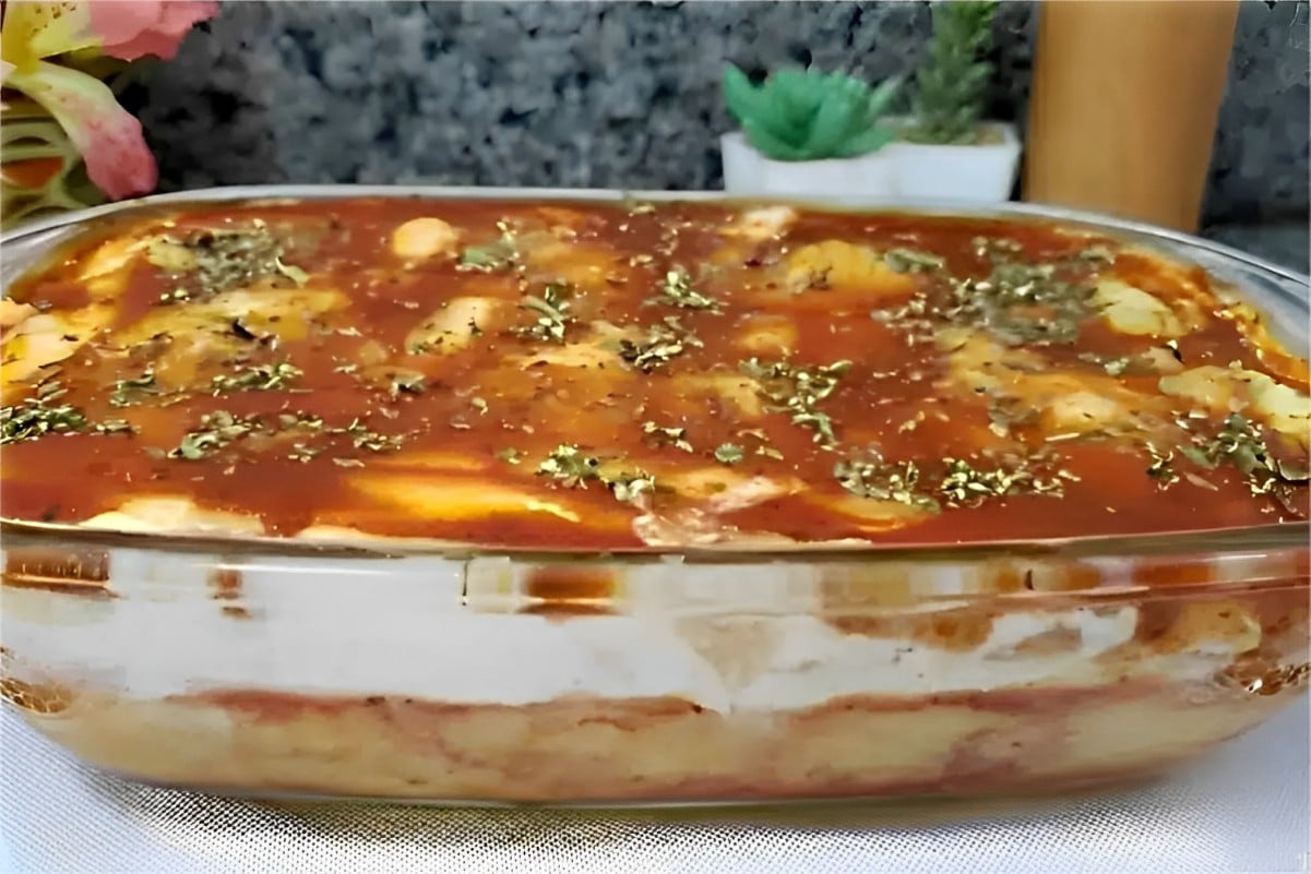 - Faça mais uma camada de molho de tomate, purê de mandioca, presunto, creme de leite e muçarela. Finalize com mais molho de tomate e salpique orégano a gosto.