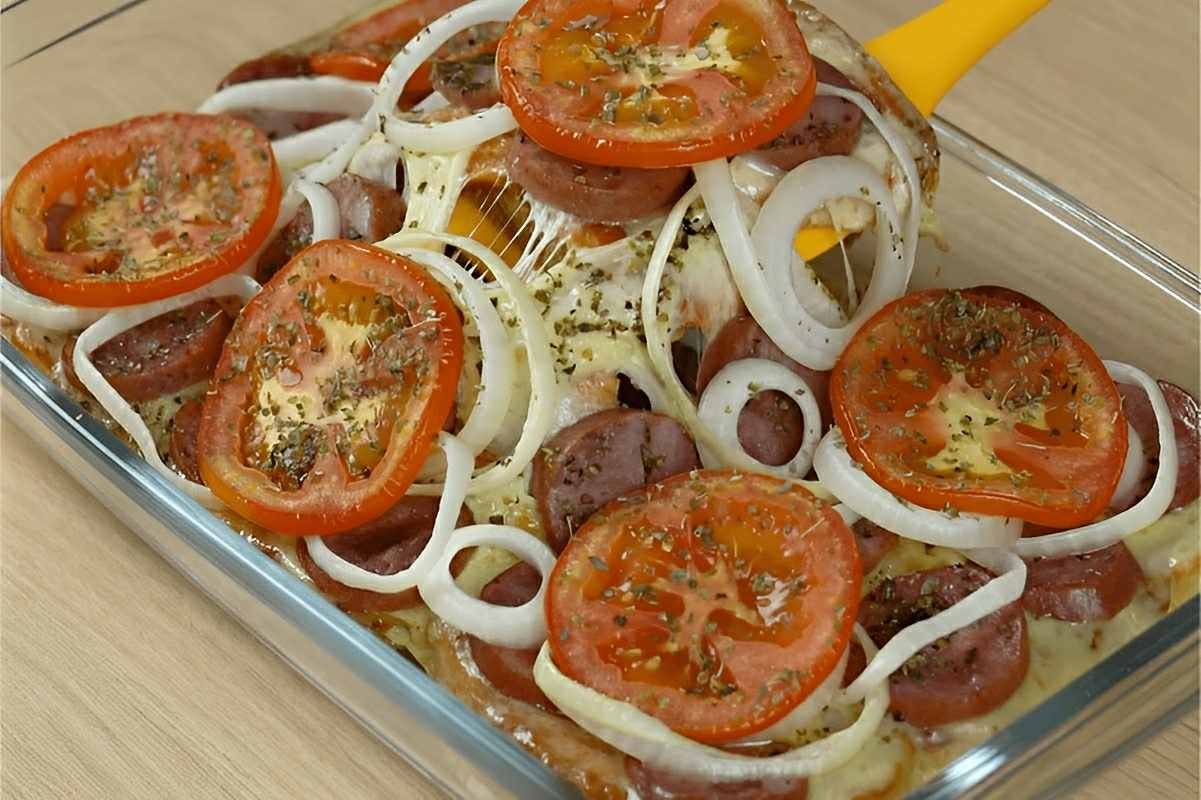 - Coloque as rodelas de linguiça, de tomate e de cebola por cima.
